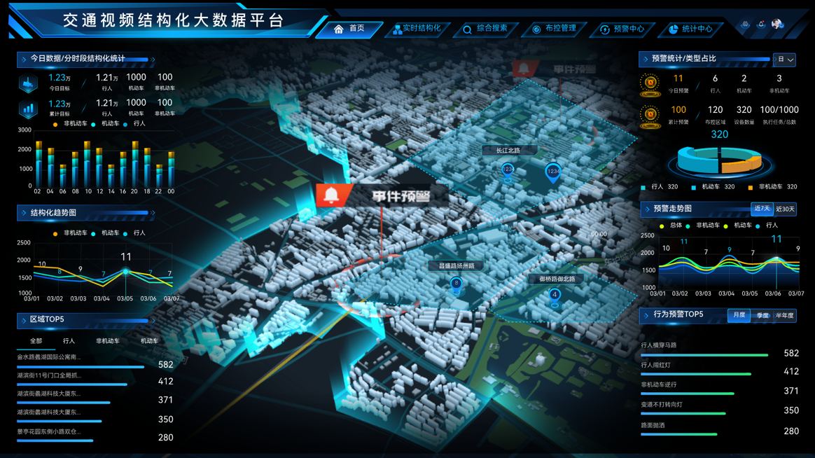 一方面为不具备结构化能力的高清监控或存量的非高清监控提供了结构化解析的能力,另一方面依托海量的结构化解析结果实现丰富的大数据应用。使用业界领先的深度网络结构,在百亿分之一的误识率下,召回率达到了90% 以上。具备结构化综合态势、实时结构化进程查看、目标结构化结果检索、以图搜图和视频片段抽取、交通违规和危险行为预警、结构化报表与统计、交通态势研判专题、丰富的开放能力等功能与优势。